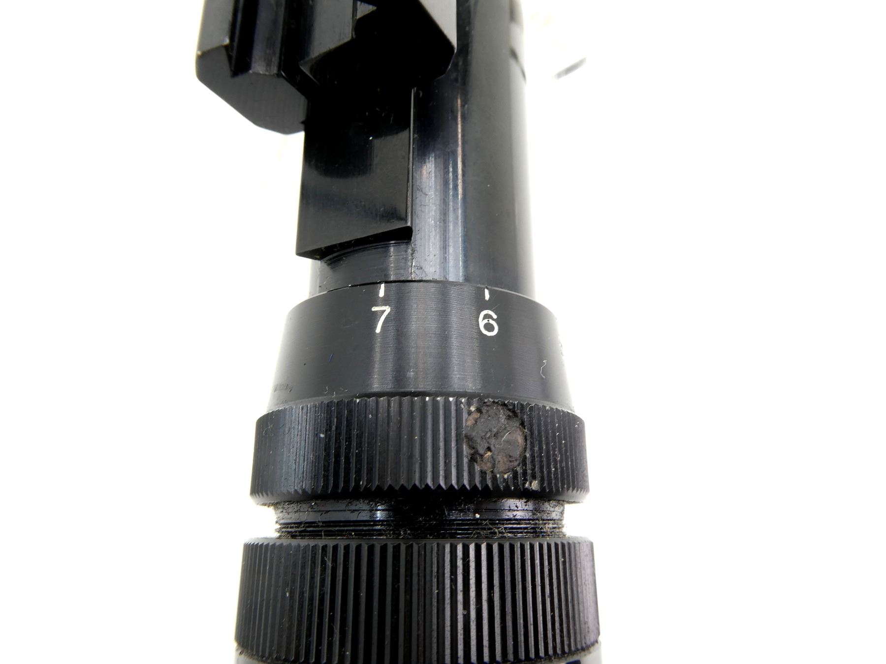 (1) CLEAR OPTICS, WITH FINE CROSSHAIR RETICLE, 22MM TUBE DIAMETER, WORKING MAGNIFICATION RING, WINDAGE & ELEVATION KNOBS TURN, MARKED: "NO. F78406", WITH MOUNTING BASE, SHOWS WEAR & TEAR / USE MARKS. SEE PHOTOS.