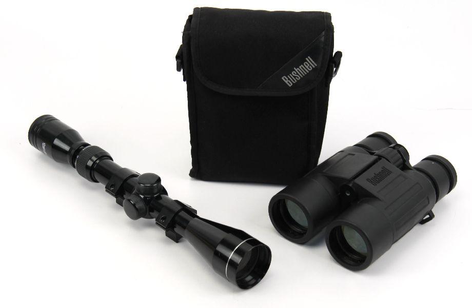 Set of Bushnell 10 x 42 binoculars, in very good condition, with nylon case. Also a Tasco 9 x 40 rifle scope, also in very good condition.