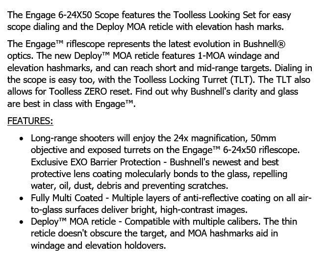 Long-range shooters will enjoy the 24x magnification, 50mm objective and exposed turrets on the Engage™ 6-24x50 riflescope. Exclusive EXO Barrier Protection - Bushnell's newest and best protective lens coating molecularly bonds to the glass, repelling water, oil, dust, debris and preventing scratches.