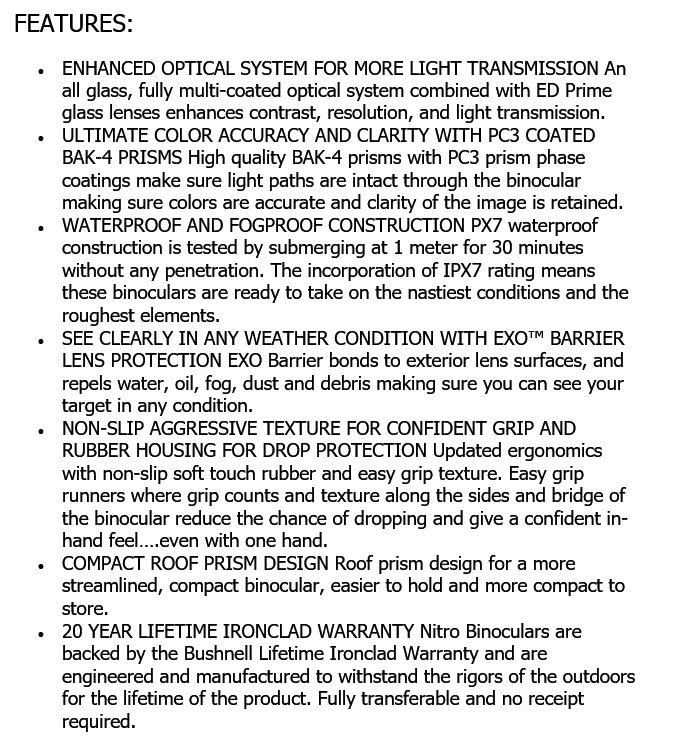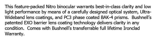 This feature-packed Nitro binocular warrants best-in-class clarity and low light performance by means of a carefully designed optical system, Ultra-Wideband lens coatings, and PC3 phase coated BAK-4 prisms. Bushnell’s patented EXO Barrier lens coating technology delivers clarity in any condition. Comes with our transferable full lifetime Ironclad Warranty.