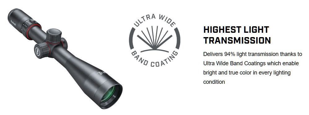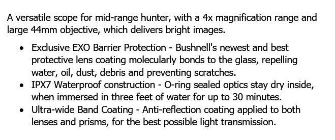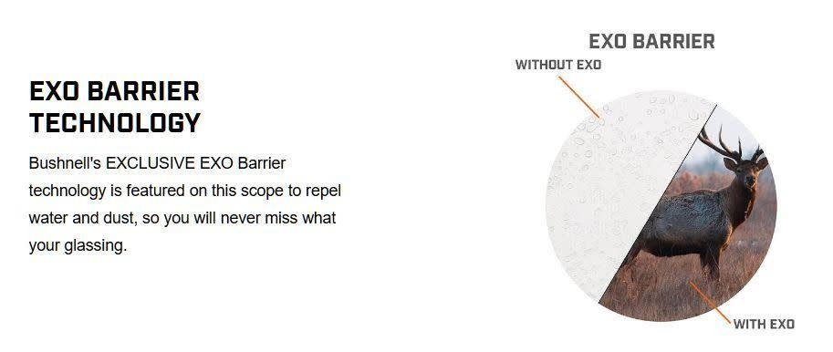 The Bushnell Nitro Riflescope is able to provide advanced optics at an affordable price point! Built to stand up to extreme environmental conditions the Bushnell Nitro Riflescopes feature IPX7 waterproof construction and EXO Barrier™ technology that products against rain, fogging, smudges, and debris. Multi-Coated low dispersion lenses deliver advanced resolution and contrast while the Nitro’s 92% Light Transmission and Ultra-Wide Band Coating ensure optimal brightness and color in any lighting condition.
