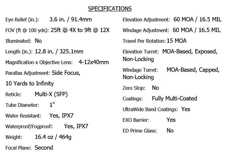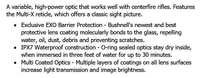 A variable, high-power optic that works well with centerfire rifles. Features the Multi-X reticle, which offers a classic sight picture.