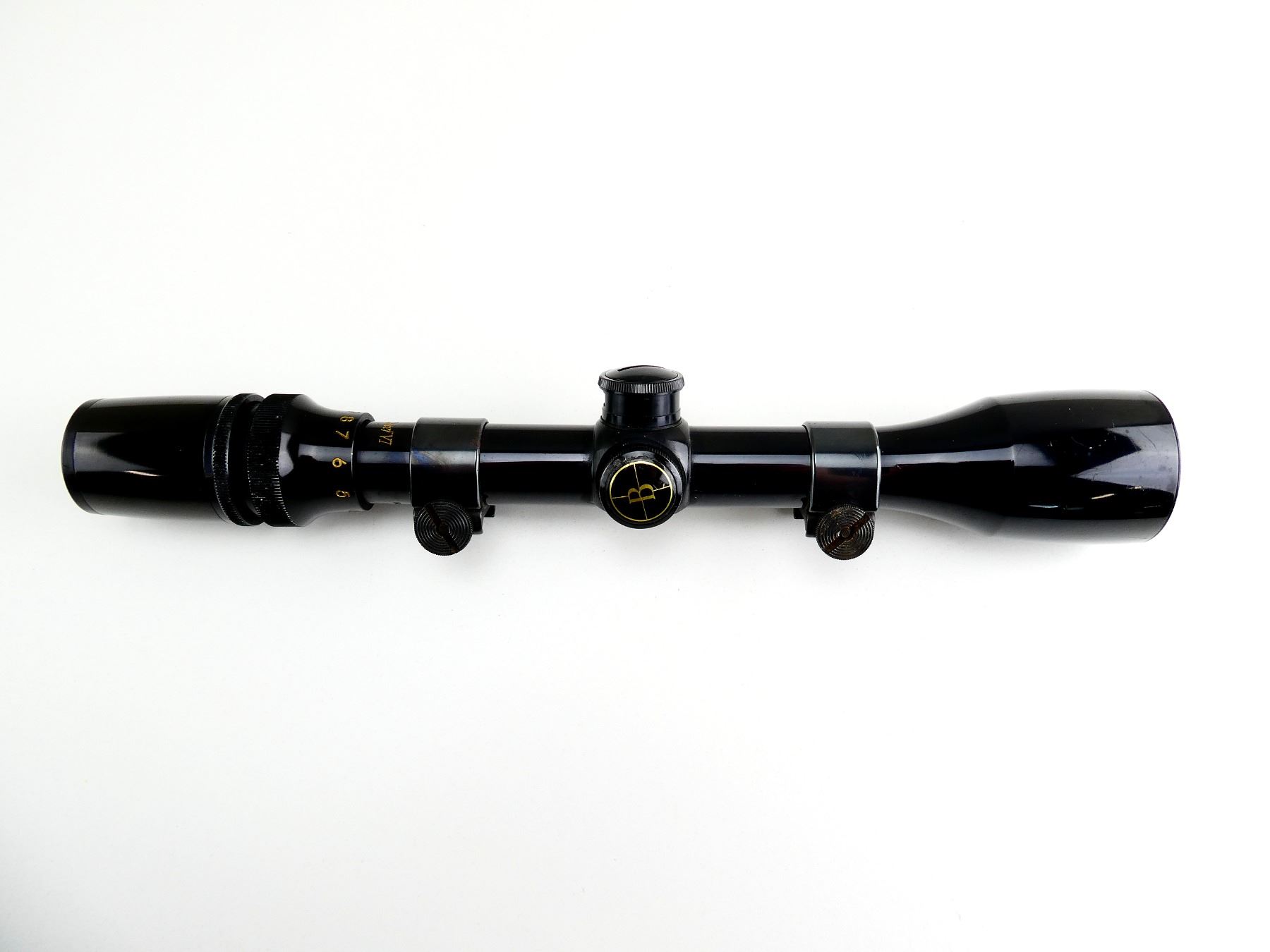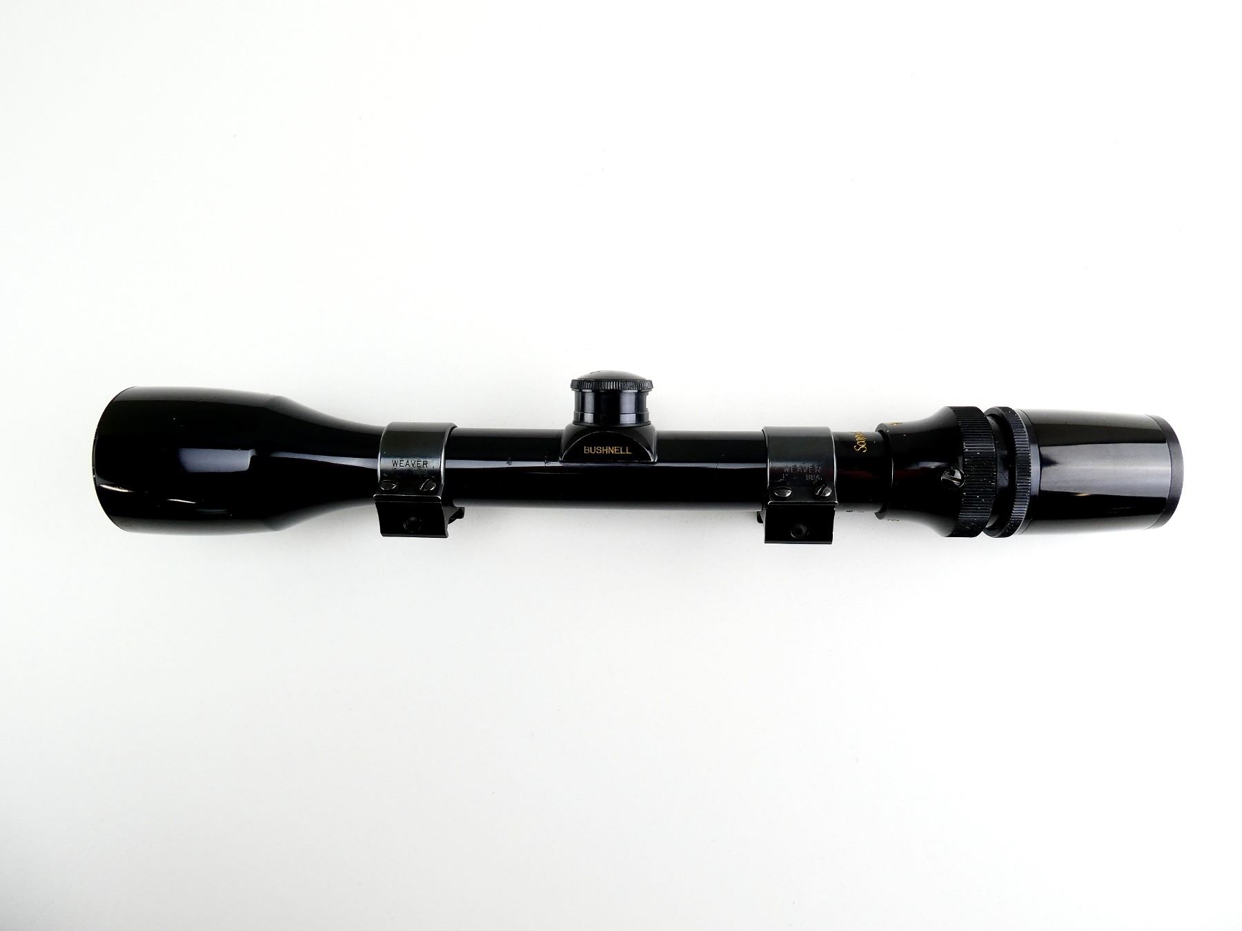 (1) CLEAR OPTICS, DUPLEX CROSSHAIR RETICLE, 1" TUBE DIAMETER, WORKING MAGNIFICATION RING 3-9, WINDAGE & ELEVATION KNOBS TURN, MARKED: "BUSHNELL SCOPE CHEF VI NO. 0192695", ETC., WITH 1" WEAVER SCOPE RINGS, SHOWS WEAR & TEAR / USE MARKS. SEE PHOTOS.
