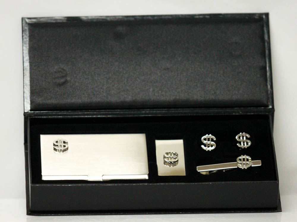 BUSINESS 4 PIECE SET "MONEY SIGN" **|**|** BUSINESS 4 PIECE SET "MONEY SIGN" INCLUDES BUSINESS CARD CASE, MONEY CLIP, CUFFLINKS, AND TIE CLIP