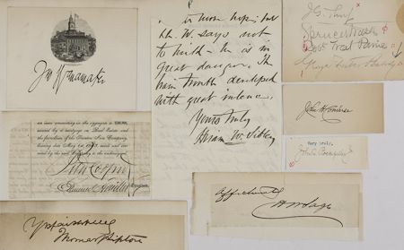 A group of eight signatures of prominent men in early twentieth-century business and philanthropy, most on small sheets and mounted. Includes: JOHN D. ROCKEFELLER, JR., JOHN WANAMAKER, GEORGE PEABODY (on a small card in pencil along with ROBERT TREAT PAINE and others), PETER COOPER, JOHN H. CONVERSE, THOMAS LIPTON and HIRAM SIBLEY (A.L.S. with slight loss at top). Eight pieces, very good condition overall.