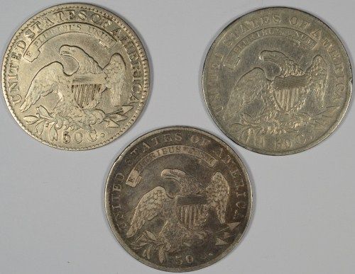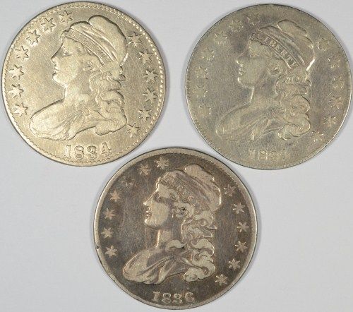 BUST HALF DOLLAR LOT: 1834 LARGE DATE, 1834 SMALL DATE, 1836 ALL VF