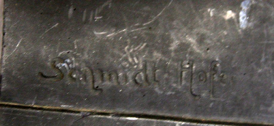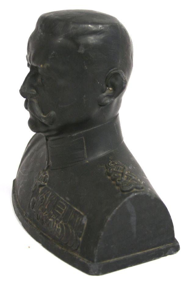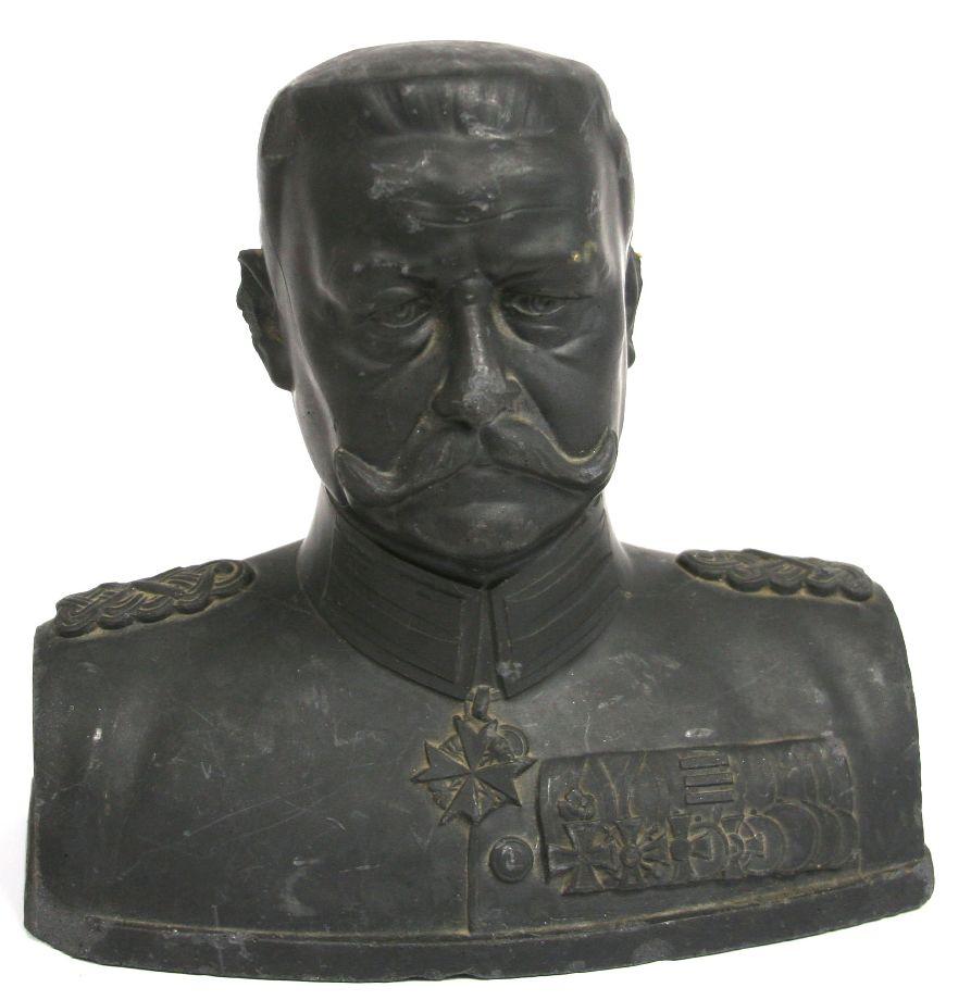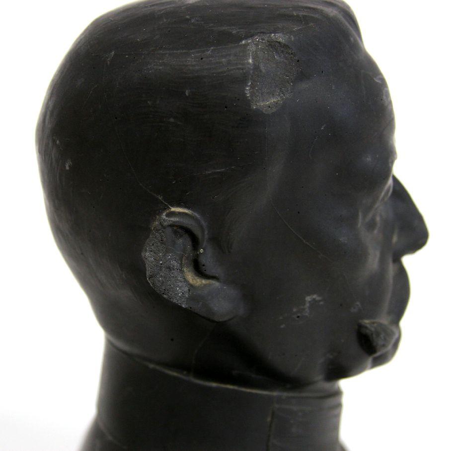 Black bust of Paul von Hindenburg, bearing medals and decorations. Measures 9 inches tall, and 9.5 wide at base. Ceramic or bakelite like material. Chips to corners, nose, and ears. Marked Schmidt Hoffer on back.