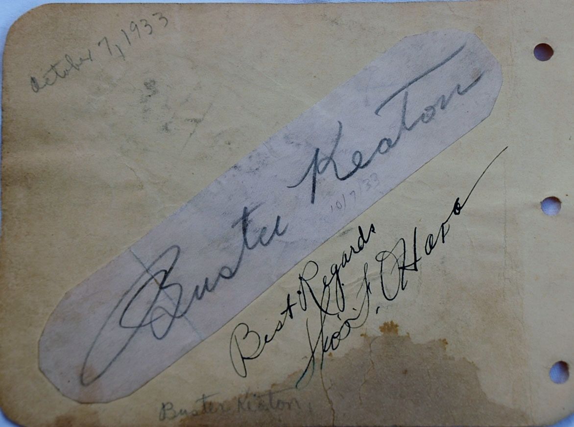 Acclaimed silent-film comic remembered for his deadpan expressions, floppy bow tie and remarkable sense of timing. Dark pencil signed paper which has been attached to album page, dated in 1933. album page also signed by unknown.