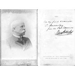 (1831 - 1901) Union major general who commanded a brigade at Bull Run, awarded the Medal of Honor for Gaines Mill, and wounded in that battle and Gettysburg. He also helped design the corps badges for the army and is credited with writing "Taps". S.P. 4 1/4" x 6 1/2" b/w [1895], a cabinet chest, up portrait of Butterfield in later years, boldly inscribed and signed on verso: "For my friend & comrade C. Sonnenborg from his Past Commander Daniel Butterfield". Backstamp by Fredericks, New York. Toned at top, lightly soiled. Verso bears superficial chipping at left affecting one letter in inscription, else very good. Private Sonnenborg served in Sickles' Brigade.