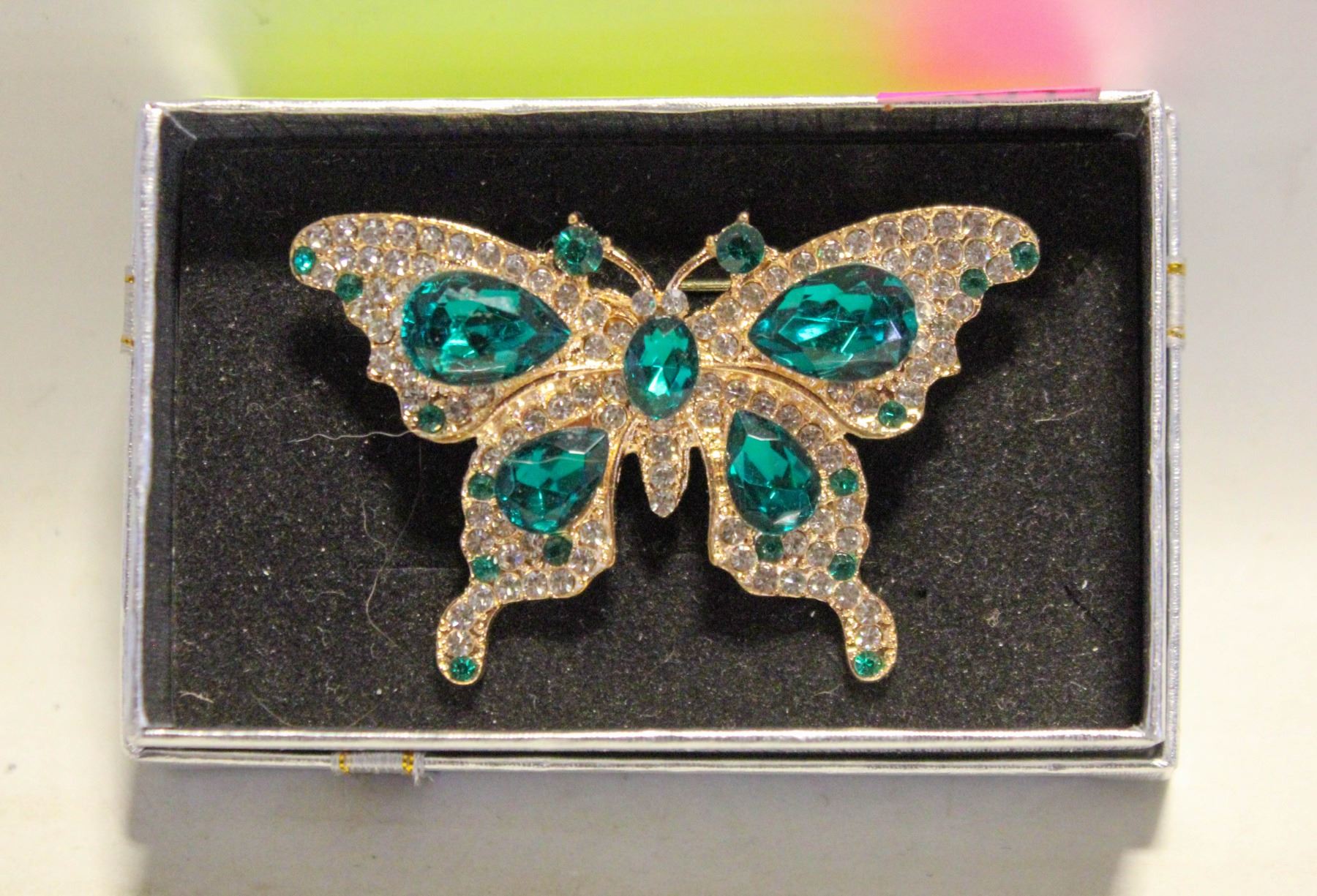 BUTTERFLY BROOCH 2.2”X1.6” GREEN+CLEAR RHINESTONES