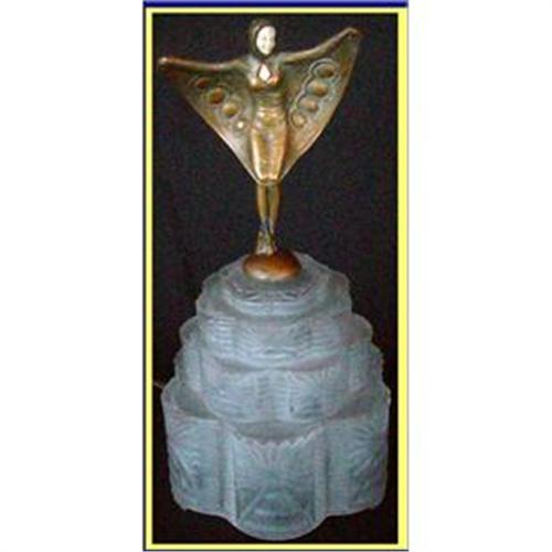 Classic Art Deco lamp in smoky Lalique style moulded glass and exceptionally modelled butterfly woman in bronze and celluloid.<BR>Measures 11 1/4inches high.<BR>The base is like a layered Deco building with graded sizes, smaller as they go up. Shaped like a flower, with the petals carved into wonderful pyramidal and fanlike geometric shapes that lead the eye towards the figure perched on top. <BR>The butterfly lady is wonderfully modelled so that while she is dressed and hooded, her clothes emphasize her form, both back and front. The clothes are in the form of a butterfly costume, finely detailed. The modelling and texture of the bronze have an almost buttery tactile look.<BR>The lamp is in excellent, original condition. Very close scrutiny will reveal a tiny chip under the base, quite unnoticeable and the gilding of the bronze is naturally, very slightly worn on the legs.