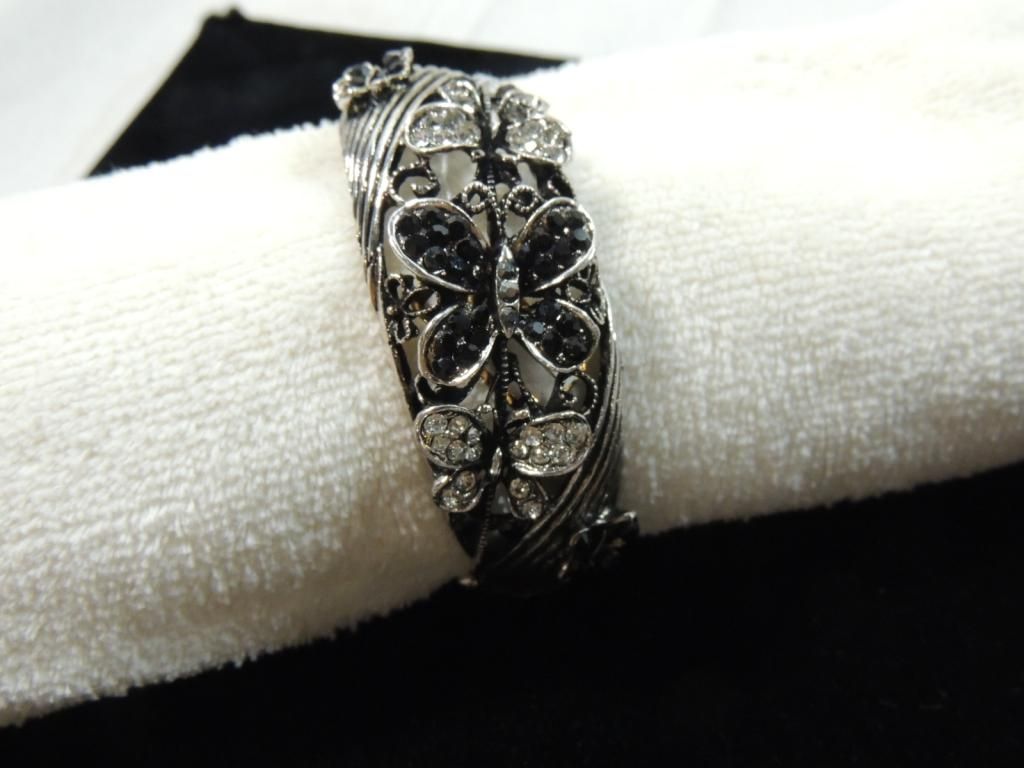 BUTTERFLY ANTIQUE SILVERTONE FINISH CLEAR AND BLACK RHINESTONE CUFF BRACELET. AS SHOWN. SEE PHOTO FOR MORE DETAILS