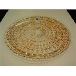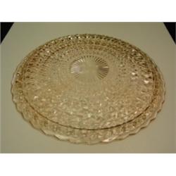 Holiday "Buttons and Bows" pink depression glass chop plate. Made by Jeannette Glass. Circa 1950. 13.75" wide. Condition: Minor surface imperfections appear to be factory generated. There is a small flake on one of the points.
