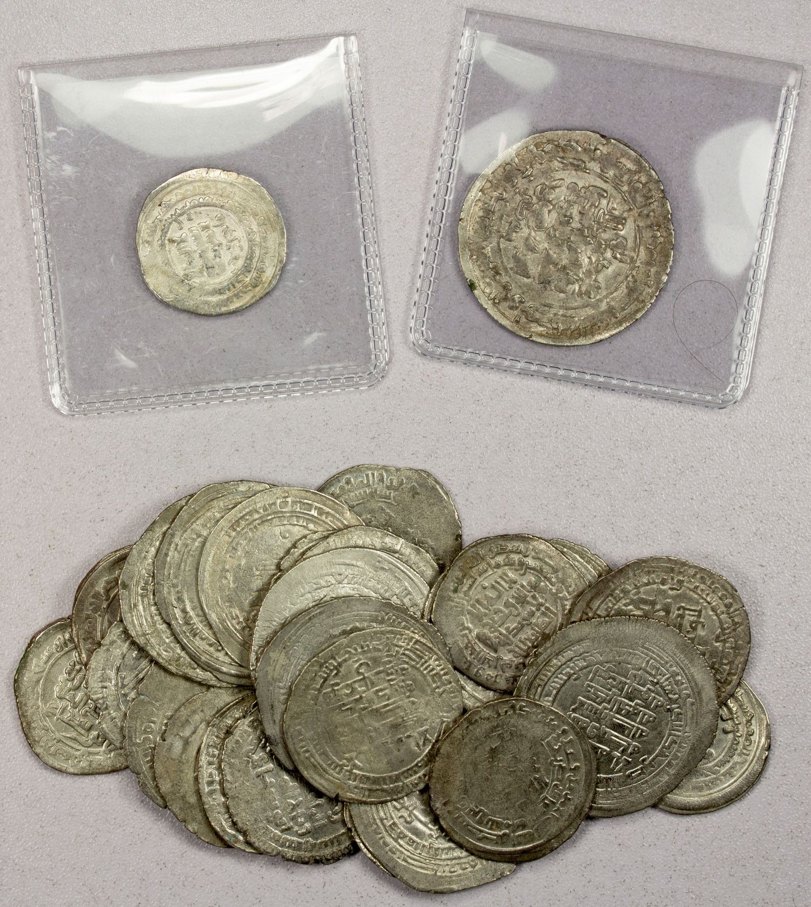 BUWAYHID: LOT of 32 silver coins, including 30 Buwayhid dirhams (nearly all 'Adud al-Dawla, mints Madinat al-Salam, Arrajan, Amul, Sariya, Isbahan, and al-Muhammadiya, many with legible date) and 2 Bavandid dirhams (one of Bisutun in the name of his deceased father Washmagir of Sariya AH361, the other of Qabus of Jurjan, blundered date); average VF, but many better; retail value $850, lot of 32 pieces.
