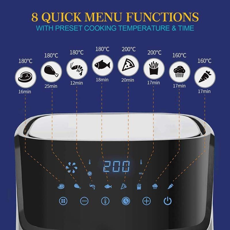 WITH 8 PRESETS, 1700W, TOUCH CONTROL PANEL, NON STICK OIL TANK AND FRYING BASKET, OVERHEAT PROTECTION, NON SLIP FEET, INSTRUCTION MANUAL, COOKBOOK, ALL PARTS CONFIRMED, AMZ SES