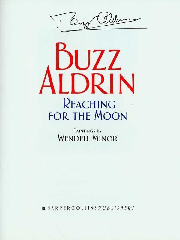 Buzz Aldrin's children's book, Reaching For the Moon, 38pp, 8¾"x11¼", HarperCollins Publishers, New York, 2005. Illustrated paintings by Wendell Minor. First Edition as stated on copyright page. Boldly signed on title page.