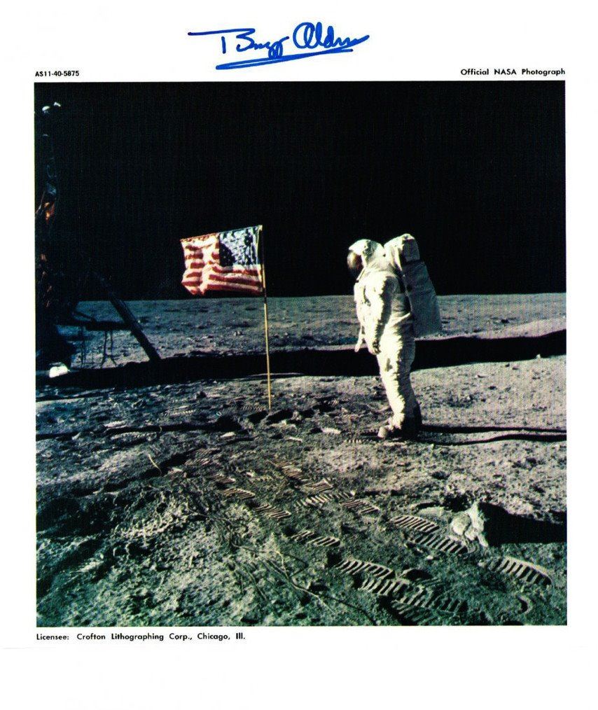An official lithograph from Nasa signed by Buzz Aldrin in blue sharpie. 7.5x8 inches. Supplied with coa.