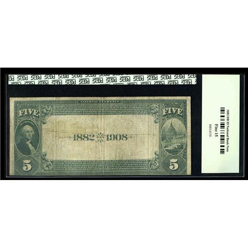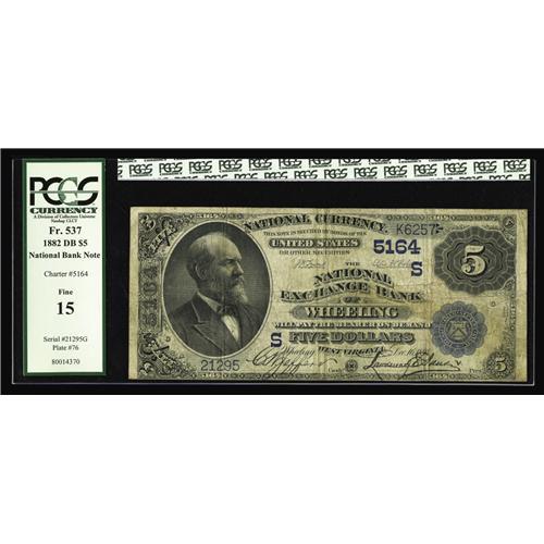 <B>Wheeling, WV</B></I> - $5 1882 Date Back Fr. 537 <B>The National Exchange Bank</B></I> Ch. # (S)5164<BR>The signatures of vice president Lawrence E. Sands and cashier C.W. Jeffers are found on this <B>PCGS Fine 15</B></I> $5.