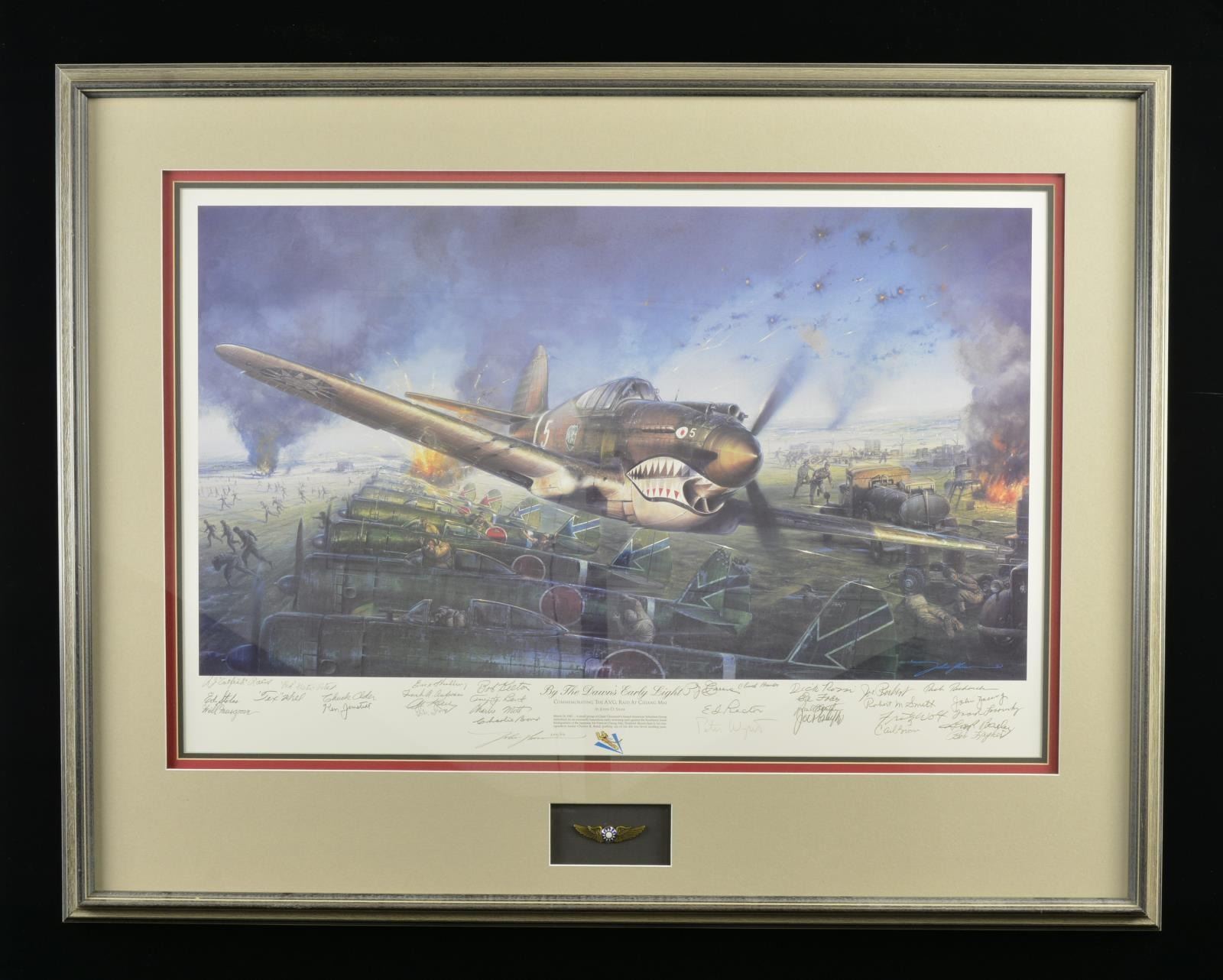 Framed print by John D. Shaw depicting the AVG Raid at Chiang Mai, Thailand. The painting shows Charles Bond's P40 during a strafing run against Japanese Ki-27 fighter planes. The print is numbered 266/850. The print includes an AVG pilot's badge. The print is signed by several Flying Tigers including Tex Hill, Peter Wright,Charlie Mott & Carl Brown. The print measures 41" x 32" & shows light wear. (02-16953-10/MJC). $300-500.