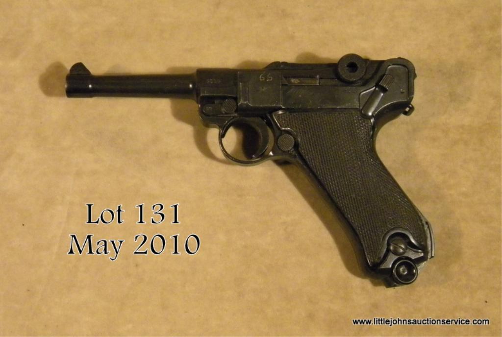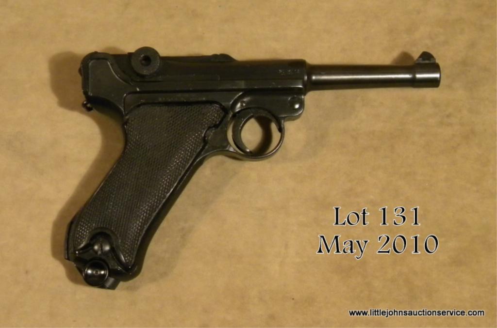 BYF code 41 Mauser Luger, # 6066s, Black Widow, reblued finish, mis-matched numbers, import marked. Retains approximately 95% of reblued finish, with minor pitting under the new finish. Overall very good condition as refinished.Retains Nazi eagle over 655 proofs, black trigger, black plastic grips. Correct black plastic base magazine is in exceptional condition and is Nazi marked with the correct XO markings. Est. $400-$800.
