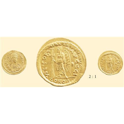AV Solidus (4.41 g). Helmeted cuirassed bust of Anastasius I, three-quarters facing, holding spear and shield / Victory standing left, holding jeweled cross, star behind, officina I. DO 3; Sear 3. This fascinating specimen was struck over another solidus of Anastasius, whose undertype is visible around the frame of the reverse where part of the legend "…NASTA-SIVS" and the emperor`s helmet plume are clear. An unusual overstrike, perhaps an error coin of the Byzantine mint.