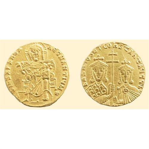 AV Solidus (4.33 g) Nimbate Christ enthroned facing, holding Gospels and raising his right hand in benediction / busts of Basil and Constantine facing, holding patriarchal cross between them. DO 2; Sear 1704.