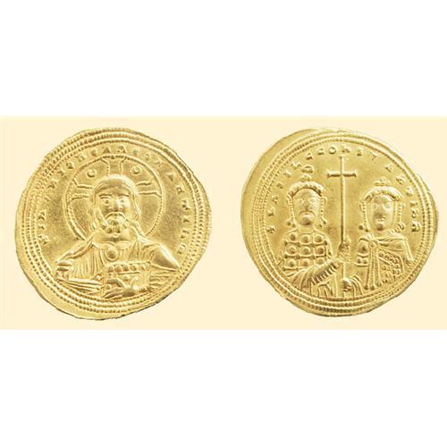 AV Histamenon Nomisma (4.37 g). Nimbate bust of Christ facing, holding the Gospels, his right hand raised in benediction, two crescent designs in the nimbus / busts of Basil and Constantine facing, holding plain cross between them. DO 6; Sear 1800. The Christ bust on the obverse is immaculate, and only the slightest of wear on the noses of the imperial busts on the reverse.