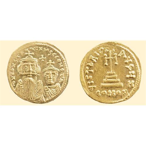 AV Solidus (4.35 g.). Draped busts of Constans II with long beard and Constantine IV beardless, both facing, each wearing crown / cross potent on three steps, officina H. DO 25; Sear 959.