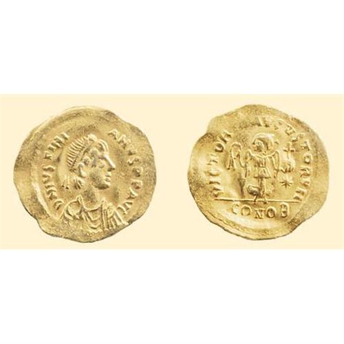 AV Tremissis (1.50 g). Constantinople. Diademed draped and cuirassed bust of Justinian I right / Victory moving right, head left, holding wreath and globus cruciger, star to right. DO 19; Sear 145.