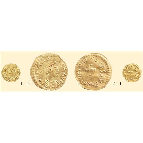 AV Half Tremissis (0.78 g). DN FOCAS PER AVI, diademed draped bust of Phocas right / VICTORI FOCAS AV, cross potent, CONOB in exergue. DO 20; Sear 635A. An extremely rare denomination, nicely centered.