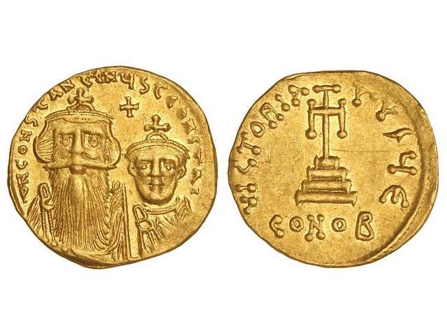 BYZANTINE COINS - Sólido. CONSTANTE II (641-668). CONSTANTINOPLA. Anv.: N. CONSTANTINS C. CONSTAN. Busto de frente de Constante y Constantino IV. Rev.: VICTORIA AVG. Cruz sobre tres escalones. En exergo: CONOB. AU. (Grafiti en reverso). Se-959. <