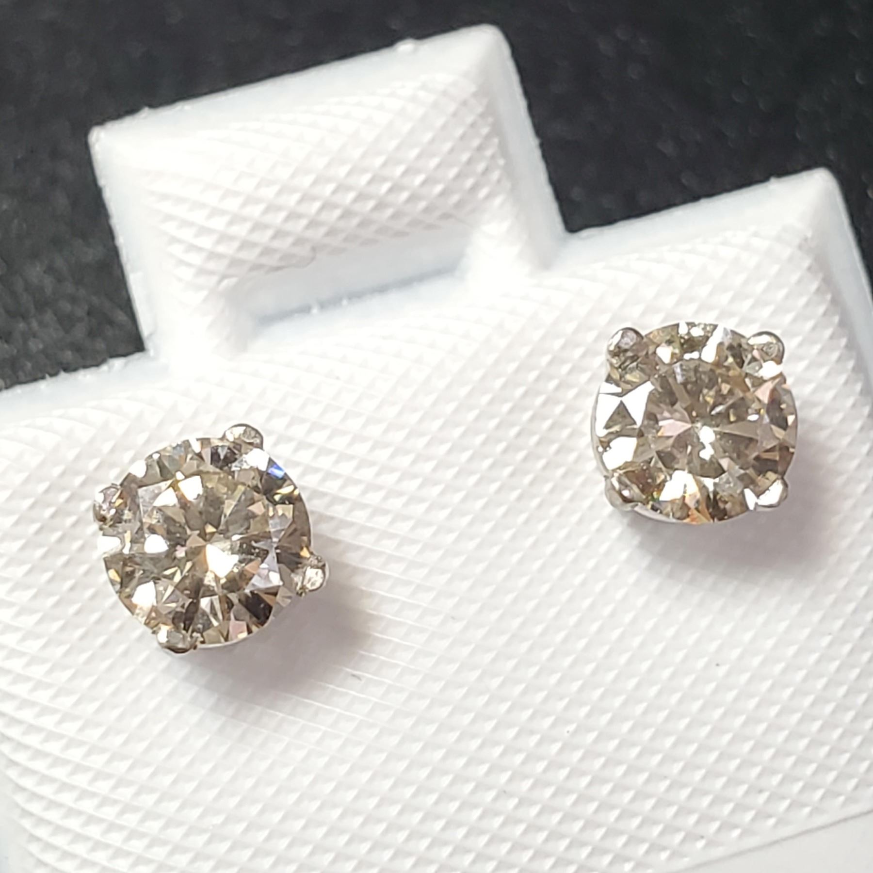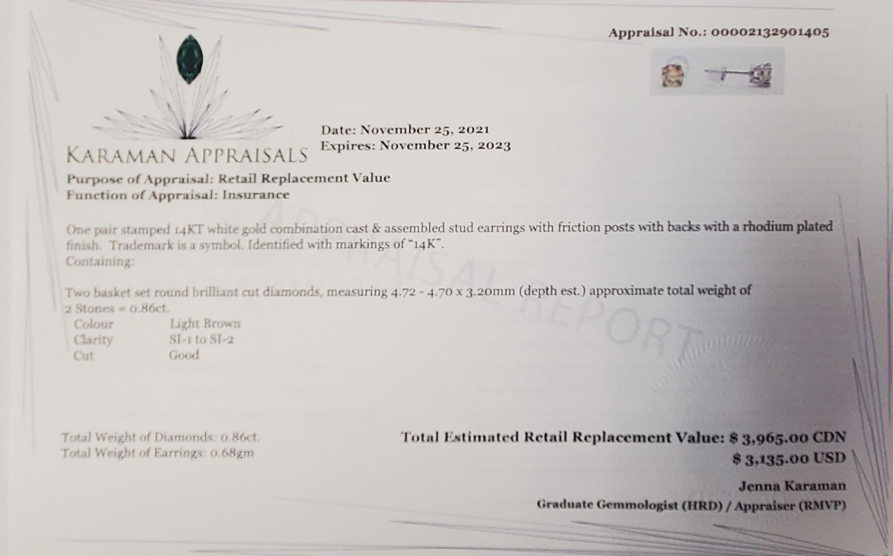 14K WHITE GOLD DIAMOND (0.86CT,SI1-2,LIGHT BROWN) EARRINGS (~WEIGHT 0.68G), MADE IN CANADA, APPRAISED RETAIL $3965