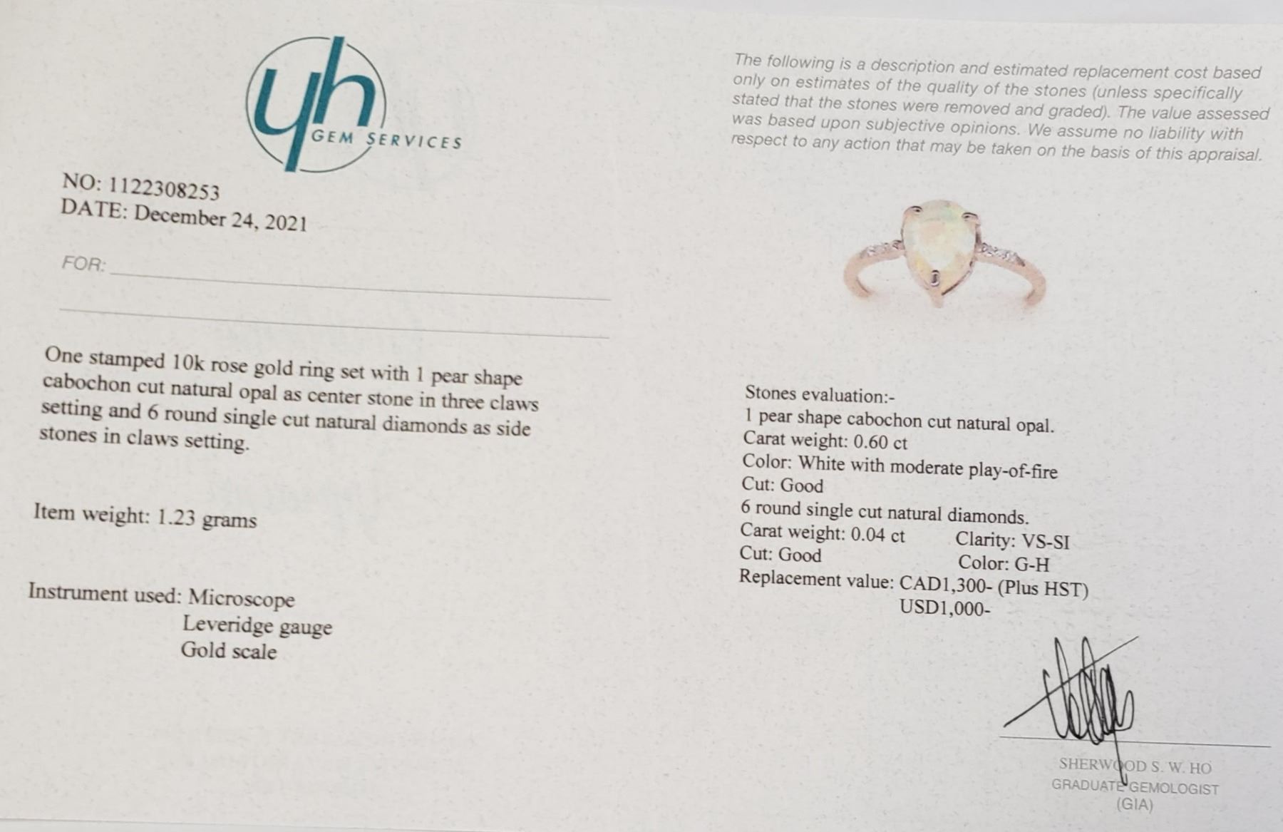 10K ROSE GOLD OPAL(0.6CT) DIAMOND(0.04CT) RING SIZE 6.5 (~WEIGHT 1.23G), MADE IN CANADA, APPRAISED RETAIL $1300**ALL ITEMS MUST BE REMOVED BY 5PM MONDAY, SEPTEMBER 17, 2022. ALL REMAINING ITEMS WILL BE SUBJECT TO A $6.00 PER DAY STORAGE CHARGE. ANY ITEMS REMAINING AFTER MONDAY, SEPTEMBER 17, 2022 WILL BE CONSIDERED FORFEITED. NO REFUNDS WILL BE ISSUED FOR FORFEITED ITEMS. TO SCHEDULE A PICK UP APPOINTMENT CLICK HERE