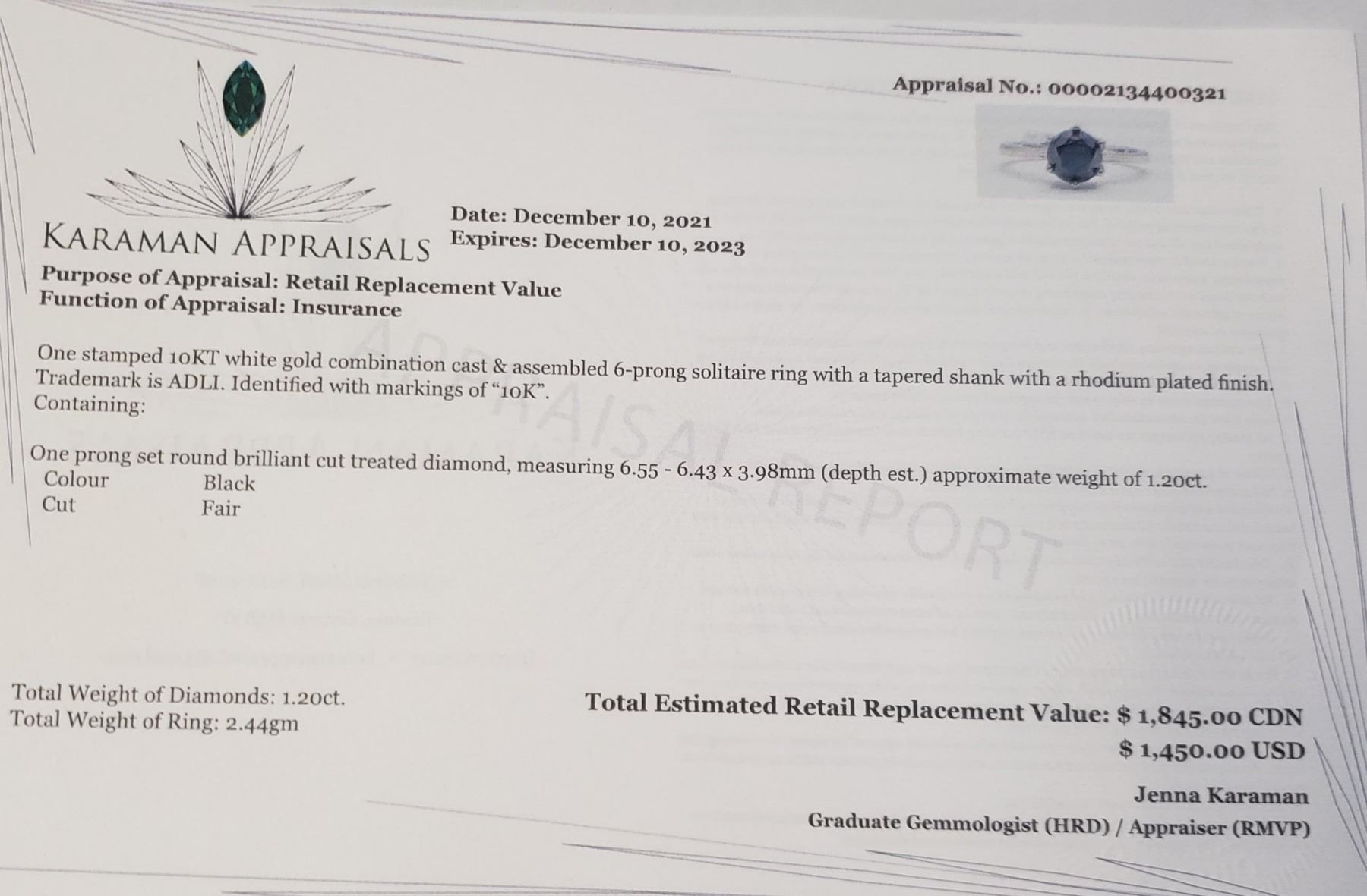 10K WHITE GOLD BLACK DIAMOND(1.2CT) RING SIZE 6 (~WEIGHT 2.44G), MADE IN CANADA, APPRAISED RETAIL $1845 **ALL ITEMS MUST BE REMOVED BY 5PM MONDAY, SEPTEMBER 10, 2022. ALL REMAINING ITEMS WILL BE SUBJECT TO A $6.00 PER DAY STORAGE CHARGE. ANY ITEMS REMAINING AFTER MONDAY, SEPTEMBER 10, 2022 WILL BE CONSIDERED FORFEITED. NO REFUNDS WILL BE ISSUED FOR FORFEITED ITEMS.TO SCHEDULE A PICK UP APPOINTMENT CLICK HERE