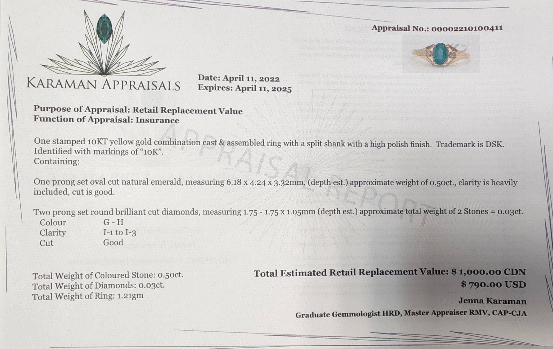 10K YELLOW GOLD EMERALD(0.5CT) DIAMOND(0.03CT) RING SIZE 6.5 WEIGHT 1.21G, MADE IN CANADA, APPRAISED RETAIL $1000 **ALL ITEMS MUST BE REMOVED BY 5PM MONDAY, SEPTEMBER 10, 2022. ALL REMAINING ITEMS WILL BE SUBJECT TO A $6.00 PER DAY STORAGE CHARGE. ANY ITEMS REMAINING AFTER MONDAY, SEPTEMBER 10, 2022 WILL BE CONSIDERED FORFEITED. NO REFUNDS WILL BE ISSUED FOR FORFEITED ITEMS.TO SCHEDULE A PICK UP APPOINTMENT CLICK HERE