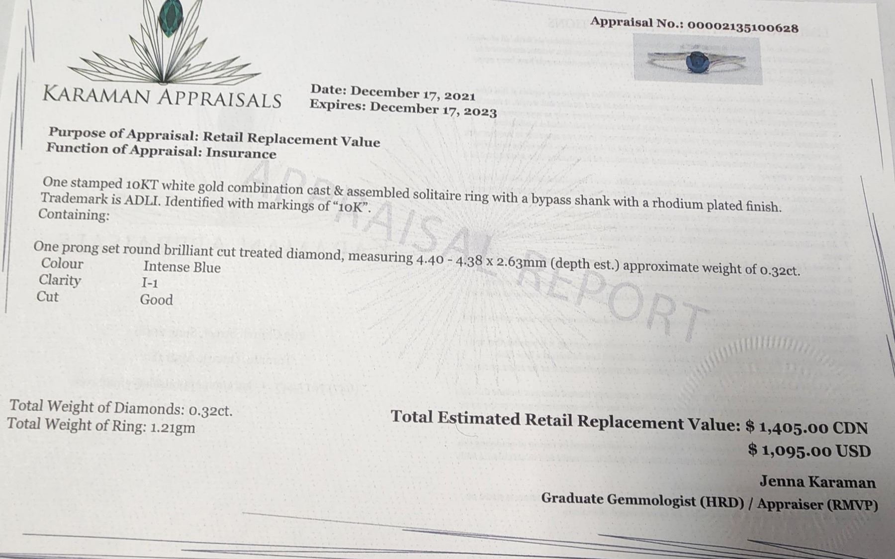 10K WHITE GOLD BLUE DIAMOND (TREATED)(0.32CT) RING SIZE 6.25 (~WEIGHT 1.21G), MADE IN CANADA, APPRAISED RETAIL $1405 **ALL ITEMS MUST BE REMOVED BY 5PM MONDAY, SEPTEMBER 10, 2022. ALL REMAINING ITEMS WILL BE SUBJECT TO A $6.00 PER DAY STORAGE CHARGE. ANY ITEMS REMAINING AFTER MONDAY, SEPTEMBER 10, 2022 WILL BE CONSIDERED FORFEITED. NO REFUNDS WILL BE ISSUED FOR FORFEITED ITEMS.TO SCHEDULE A PICK UP APPOINTMENT CLICK HERE