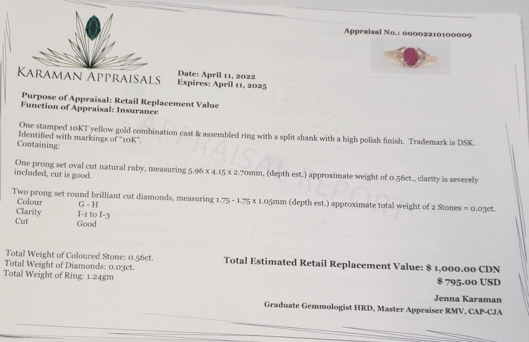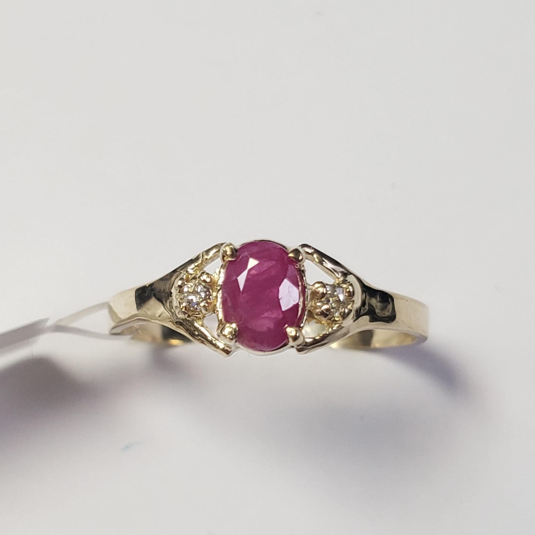 10K YELLOW GOLD RUBY(0.56CT) DIAMOND(0.03CT) RING SIZE 6.5 (~WEIGHT 1.24G), MADE IN CANADA, APPRAISED RETAIL $1000 **ALL ITEMS MUST BE REMOVED BY 5PM MONDAY, SEPTEMBER 10, 2022. ALL REMAINING ITEMS WILL BE SUBJECT TO A $6.00 PER DAY STORAGE CHARGE. ANY ITEMS REMAINING AFTER MONDAY, SEPTEMBER 10, 2022 WILL BE CONSIDERED FORFEITED. NO REFUNDS WILL BE ISSUED FOR FORFEITED ITEMS.TO SCHEDULE A PICK UP APPOINTMENT CLICK HERE