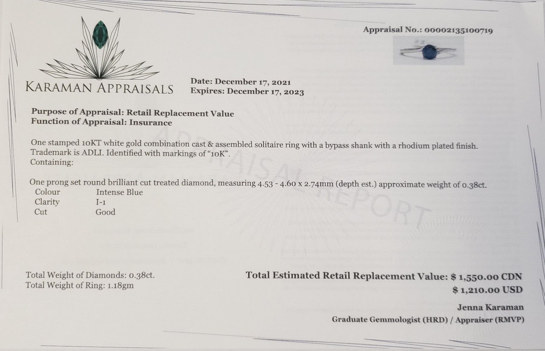 10K YWG BLUE DIAMOND (TREATED)(0.38CT) RING SIZE 6.25 (~WEIGHT 1.18G), MADE IN CANADA, APPRAISED RETAIL $1550 **ALL ITEMS MUST BE REMOVED BY 5PM MONDAY, SEPTEMBER 10, 2022. ALL REMAINING ITEMS WILL BE SUBJECT TO A $6.00 PER DAY STORAGE CHARGE. ANY ITEMS REMAINING AFTER MONDAY, SEPTEMBER 10, 2022 WILL BE CONSIDERED FORFEITED. NO REFUNDS WILL BE ISSUED FOR FORFEITED ITEMS.TO SCHEDULE A PICK UP APPOINTMENT CLICK HERE