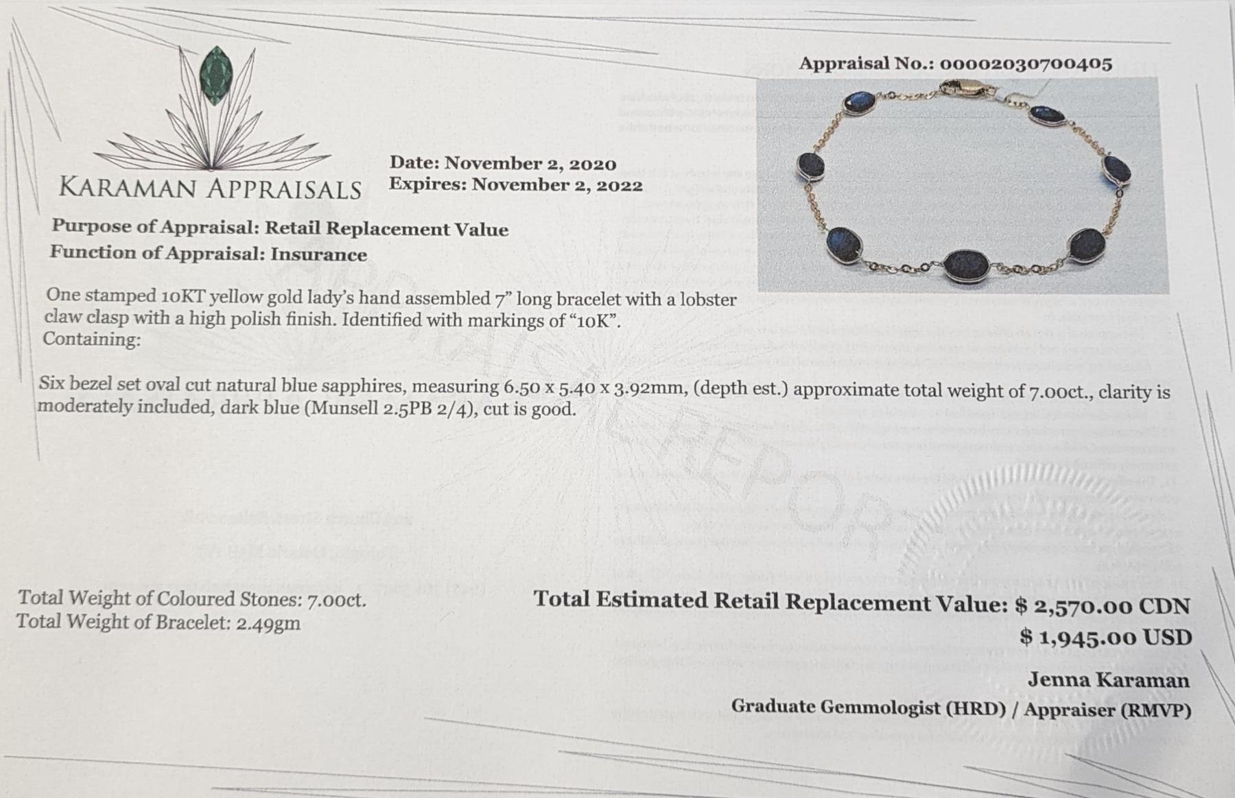 10K YELLOW GOLD SAPPHIRE 7"(7CT) BRACELET WEIGHT 2.49G, MADE IN CANADA, APPRAISED RETAIL $2570