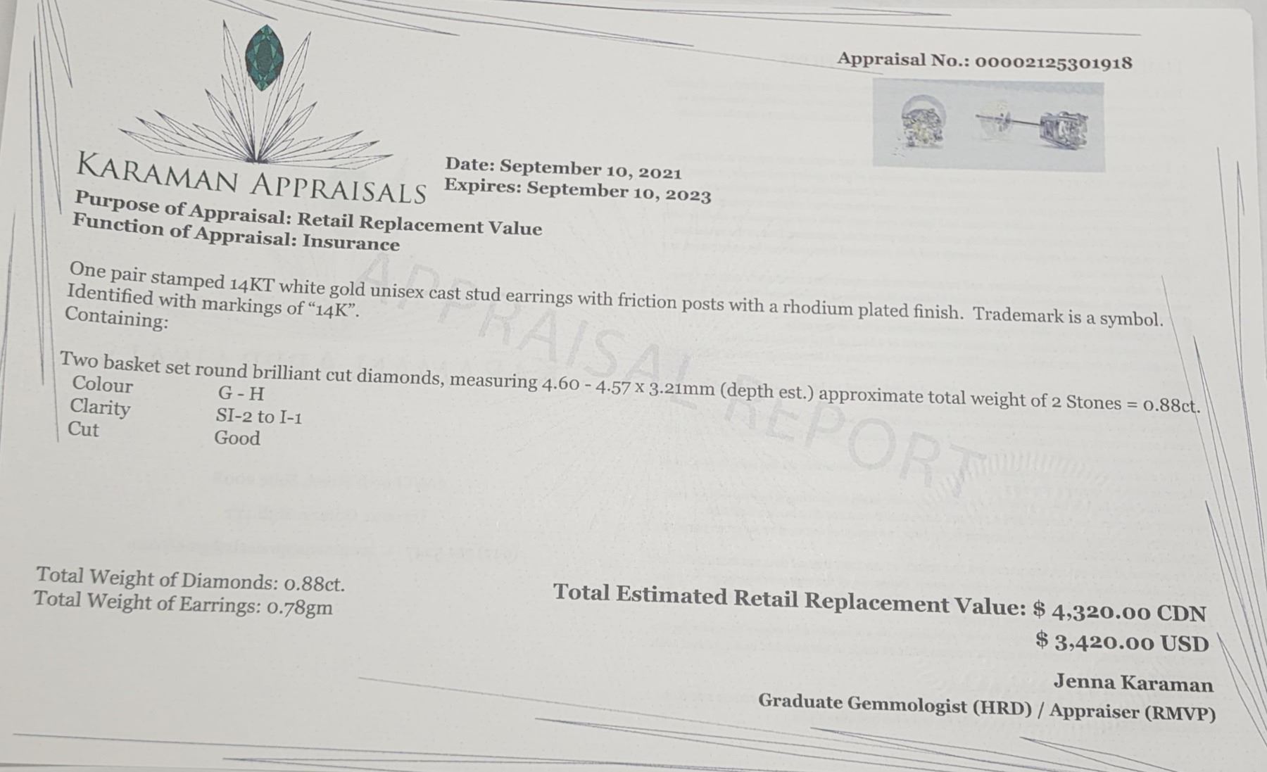 14K WHITE GOLD DIAMOND (0.88CT,SI2-I1,G-H) EARRINGS (~WEIGHT 0.78G), MADE IN CANADA, APPRAISED RETAIL $4320. ALL ITEMS MUST BE REMOVED WITHIN 5 DAYS OF SALE
