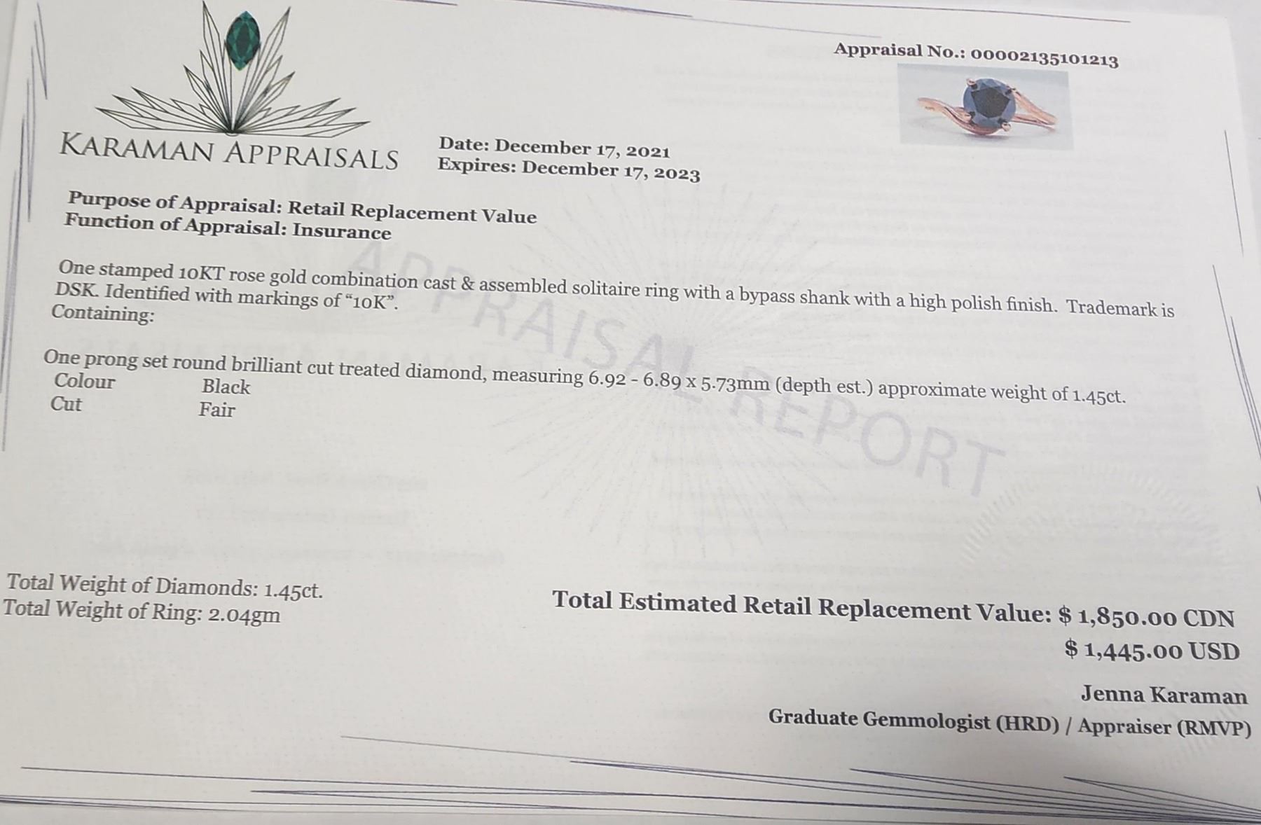 10K ROSE GOLD BLACK DIAMOND(1.45CT) RING SIZE 7.5 (RING IS RESIZABLE FOR $40) (~WEIGHT 2.04G), MADE IN CANADA, APPRAISED RETAIL $1850