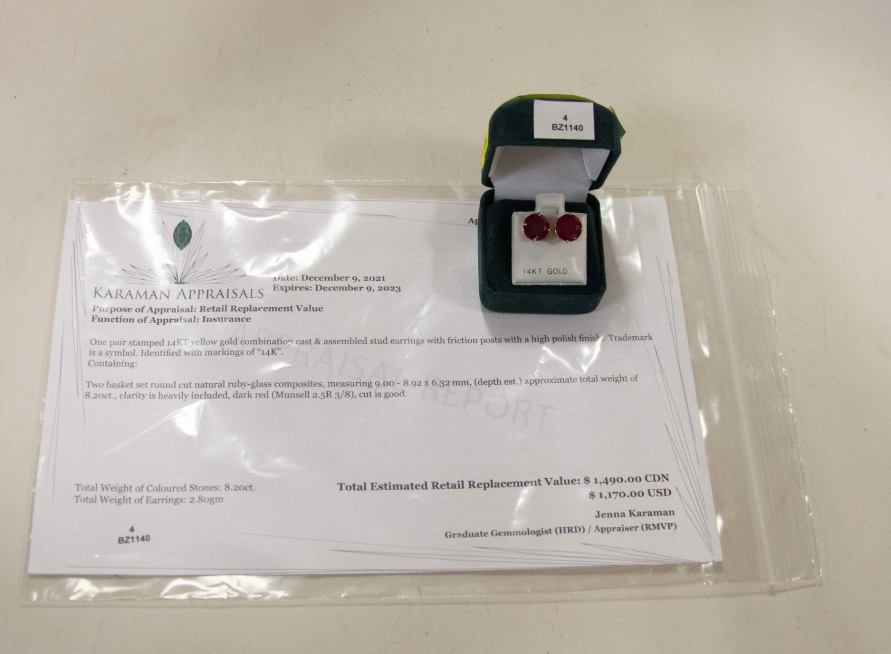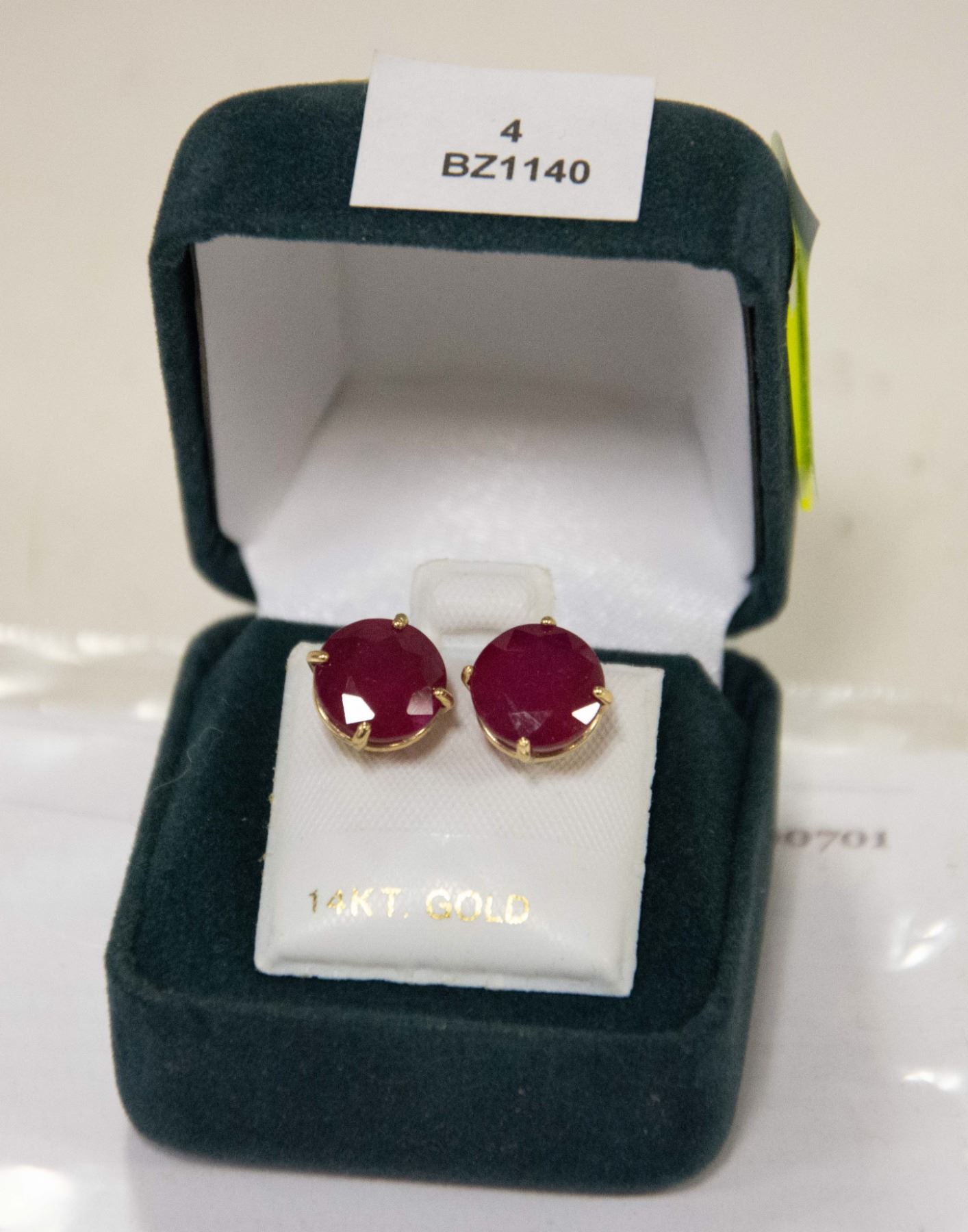 14K YELLOW GOLD NATURAL RUBY-GLASS COMPOSITE (8.2CT) EARRINGS, WEIGHT 2.8G, MADE IN CANADA, APPRAISED RETAIL $1490