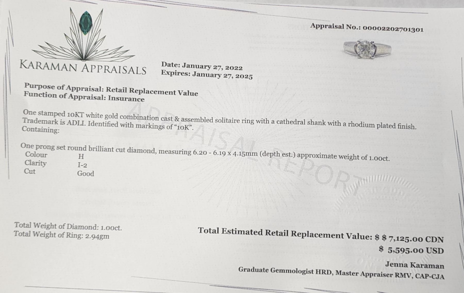 10K WHITE GOLD, DIAMOND (1CT,I2,H) RING SIZE 6.25 WEIGHT 2.94G, MADE IN CANADA, APPRAISED RETAIL $7125**ALL ITEMS MUST BE REMOVED BY 5PM MONDAY, OCTOBER 17TH, 2022. ALL REMAINING ITEMS WILL BE SUBJECT TO A $6.00 PER DAY STORAGE CHARGE. ANY ITEMS REMAINING AFTER MONDAY, OCTOBER 29, 2022 WILL BE CONSIDERED FORFEITED. NO REFUNDS WILL BE ISSUED FOR FORFEITED ITEMS. TO SCHEDULE A PICK UP APPOINTMENT CLICK HERE
