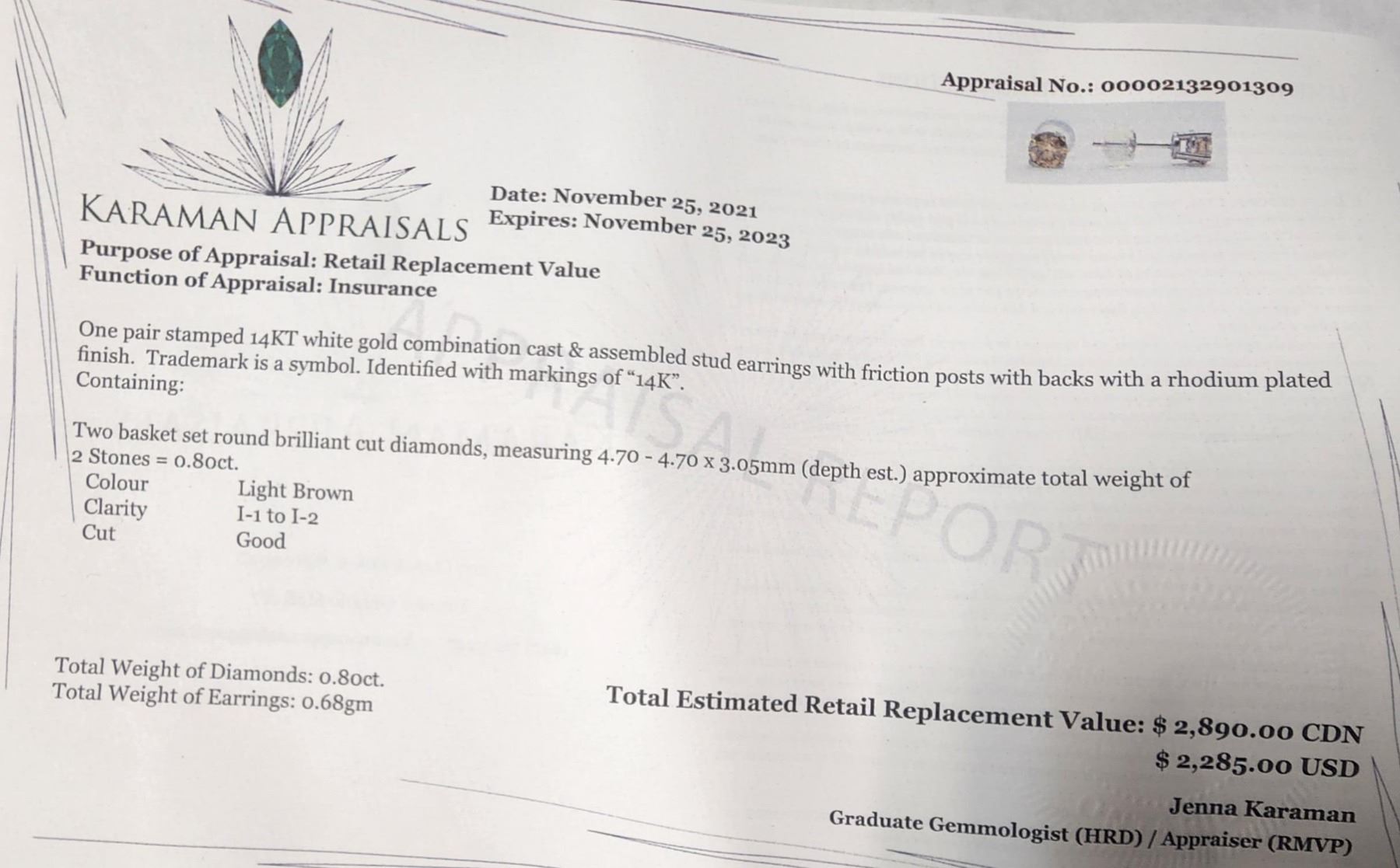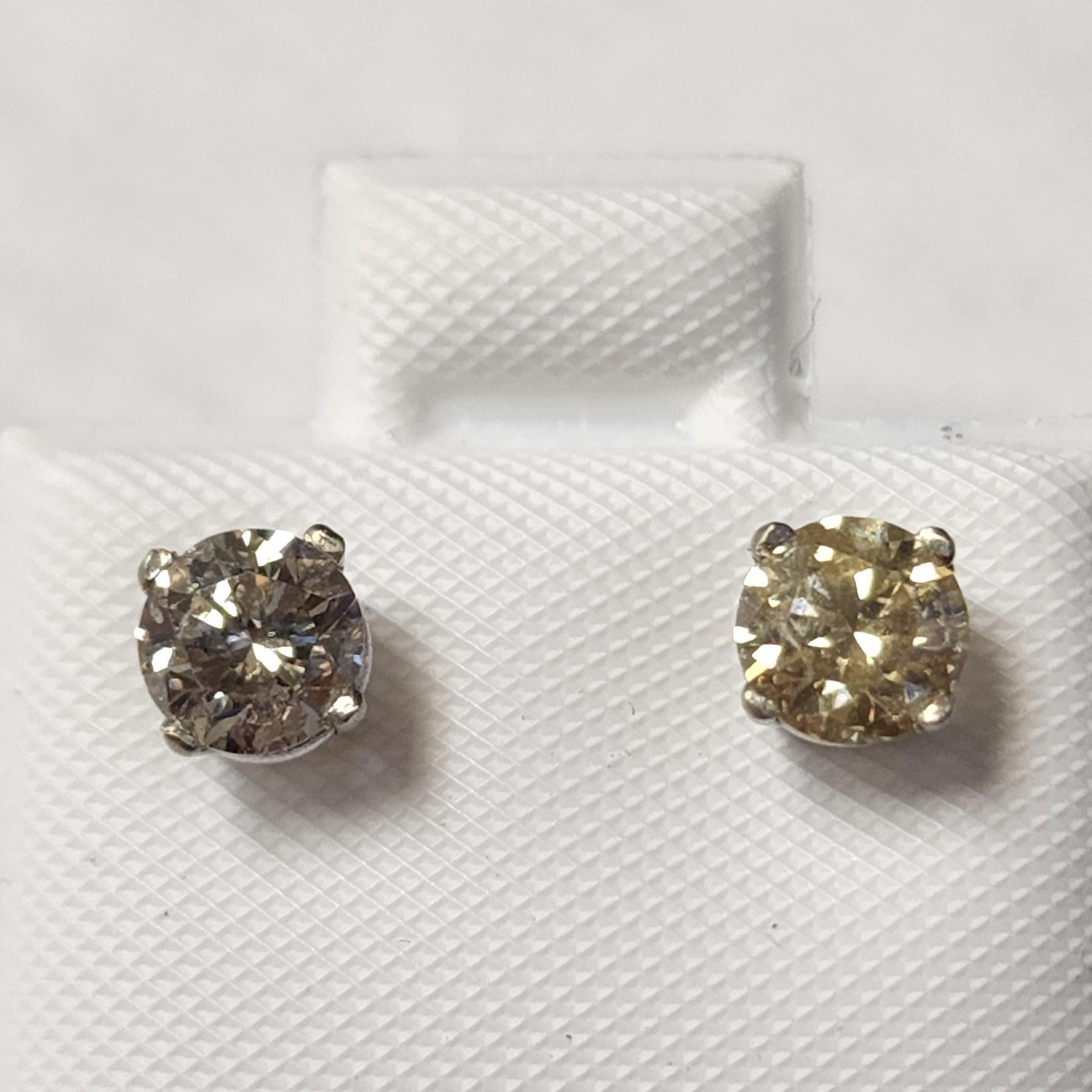 14K WHITE GOLD DIAMOND (0.8CT,I1-2,LIGHT BROWN) EARRINGS WEIGHT 0.68G, MADE IN CANADA, APPRAISED RETAIL $2890. EARRINGS ARE TWO DIFFERENT SHADES**ALL ITEMS MUST BE REMOVED BY 5PM MONDAY, OCTOBER 17TH, 2022. ALL REMAINING ITEMS WILL BE SUBJECT TO A $6.00 PER DAY STORAGE CHARGE. ANY ITEMS REMAINING AFTER MONDAY, OCTOBER 29, 2022 WILL BE CONSIDERED FORFEITED. NO REFUNDS WILL BE ISSUED FOR FORFEITED ITEMS. TO SCHEDULE A PICK UP APPOINTMENT CLICK HERE