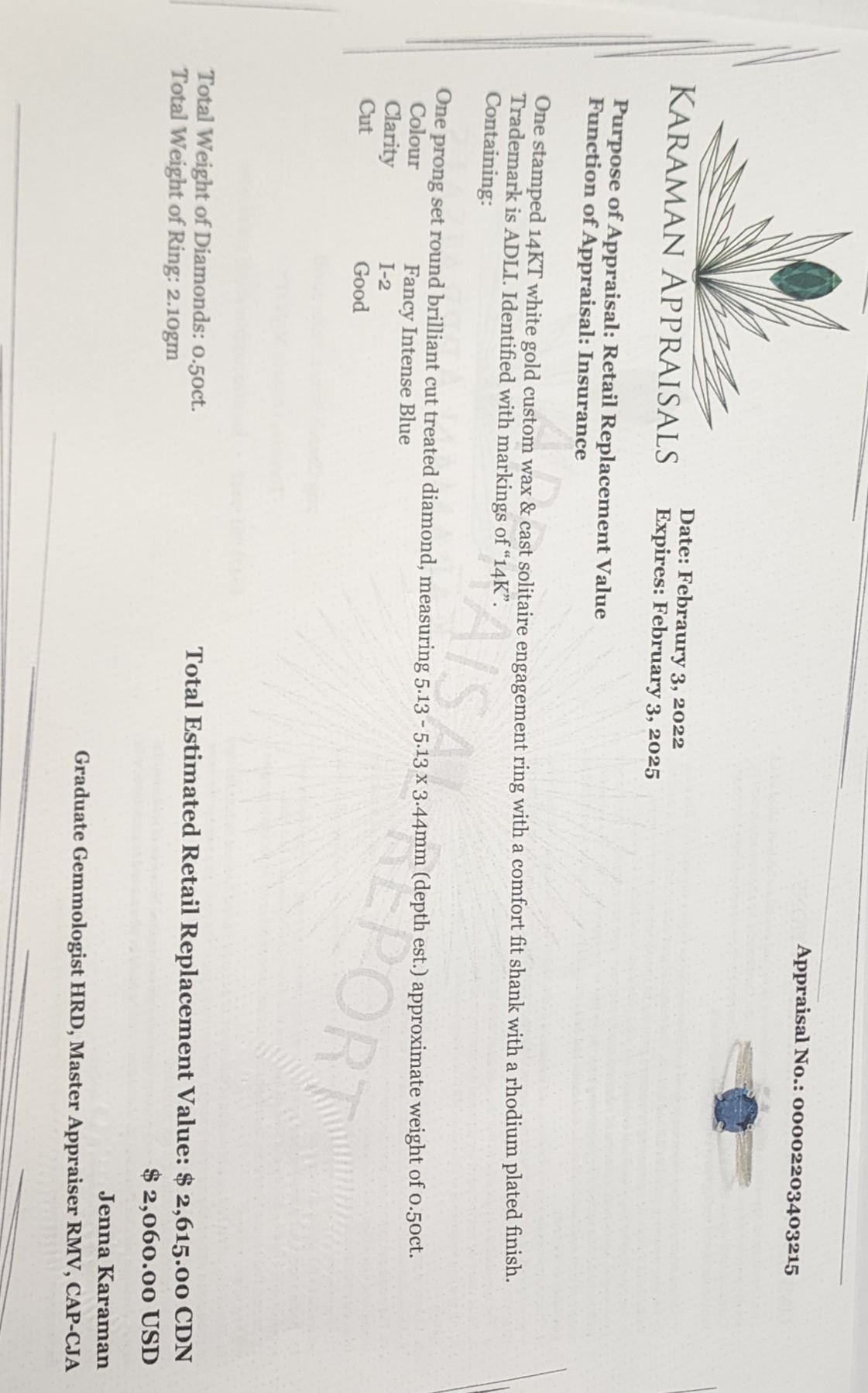 14K WHITE GOLD DIAMOND (0.5CT,I2,FANCY BLUE COLOUR ENHANCED) RING. SIZE 6.5, WEIGHT 2.1G. MADE IN CANADA, SUGGESTED RETAIL VALUE $2615