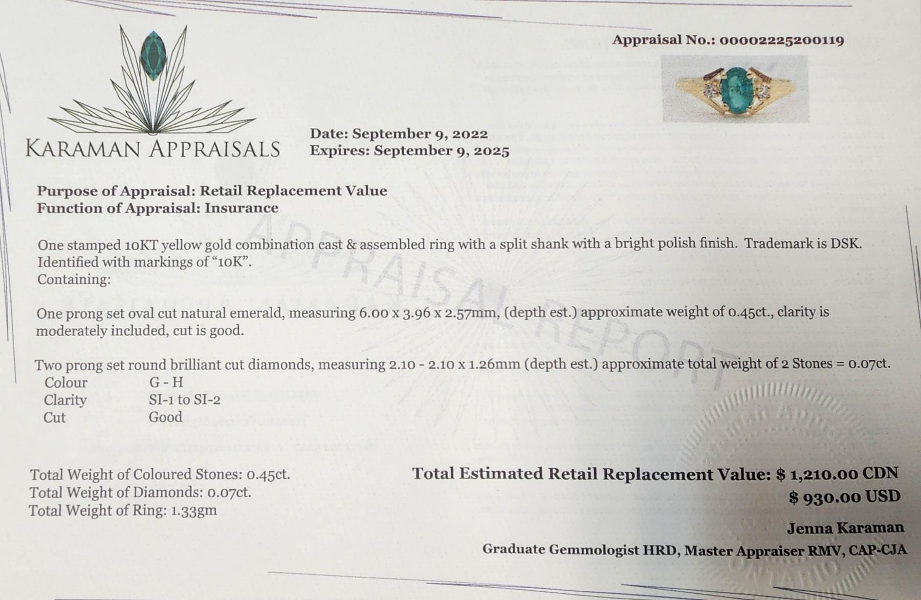 10K YELLOW GOLD, EMERALD(0.45CT) DIAMOND(0.07CT) RING SIZE 6.25, WEIGHT 1.33G, MADE IN CANADA, APPRAISED RETAIL $1210