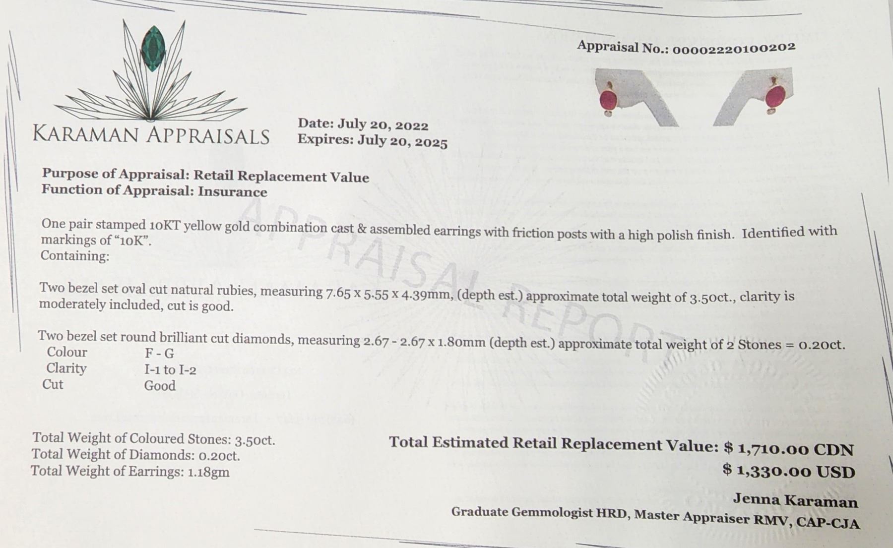 10K YELLOW GOLD, RUBY(3.5CT) DIAMOND(0.2CT) EARRINGS WEIGHT 1.18G, APPRAISED RETAIL $1710 **ALL ITEMS MUST BE REMOVED BY 5PM SATURDAY, APRIL 15TH 2023. ALL REMAINING ITEMS WILL BE SUBJECT TO A $6.00 PER DAY STORAGE CHARGE. ANY ITEMS REMAINING AFTER MONDAY, APRIL 30TH, 2023 WILL BE CONSIDERED FORFEITED. NO REFUNDS WILL BE ISSUED FOR FORFEITED ITEMS. TO SCHEDULE A PICK UP APPOINTMENT CLICK HERE