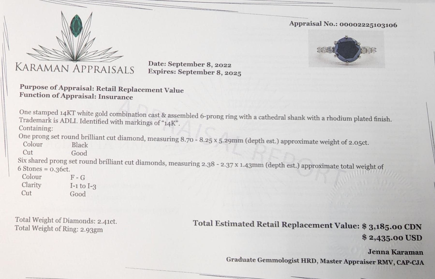 14K WHITE GOLD, BLACK DIAMOND(2.05CT) DIAMOND(0.36CT) RING SIZE 7, WEIGHT 2.93G, MADE IN CANADA, APPRAISED RETAIL $3185 **ALL ITEMS MUST BE REMOVED BY 5PM SATURDAY, MAY 13TH 2023. ALL REMAINING ITEMS WILL BE SUBJECT TO A $6.00 PER DAY STORAGE CHARGE. ANY ITEMS REMAINING AFTER MONDAY, MAY 29TH, 2023 WILL BE CONSIDERED FORFEITED. NO REFUNDS WILL BE ISSUED FOR FORFEITED ITEMS. TO SCHEDULE A PICK UP APPOINTMENT CLICK HERE