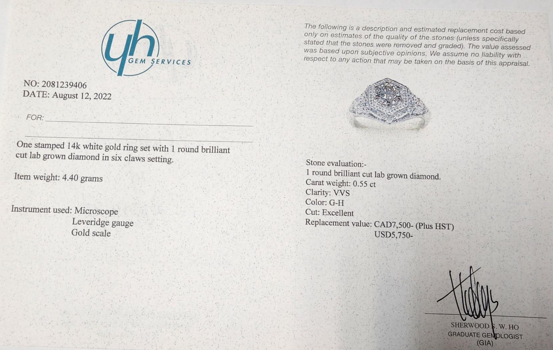 14K WHITE GOLD, LAB GROWN DIAMOND (0.55CT,VVS,G-H) RING SIZE 7, WEIGHT 4.4G, MADE IN CANADA, APPRAISED RETAIL $7500 **ALL ITEMS MUST BE REMOVED BY 5PM SATURDAY, MAY 13TH 2023. ALL REMAINING ITEMS WILL BE SUBJECT TO A $6.00 PER DAY STORAGE CHARGE. ANY ITEMS REMAINING AFTER MONDAY, MAY 29TH, 2023 WILL BE CONSIDERED FORFEITED. NO REFUNDS WILL BE ISSUED FOR FORFEITED ITEMS. TO SCHEDULE A PICK UP APPOINTMENT CLICK HERE