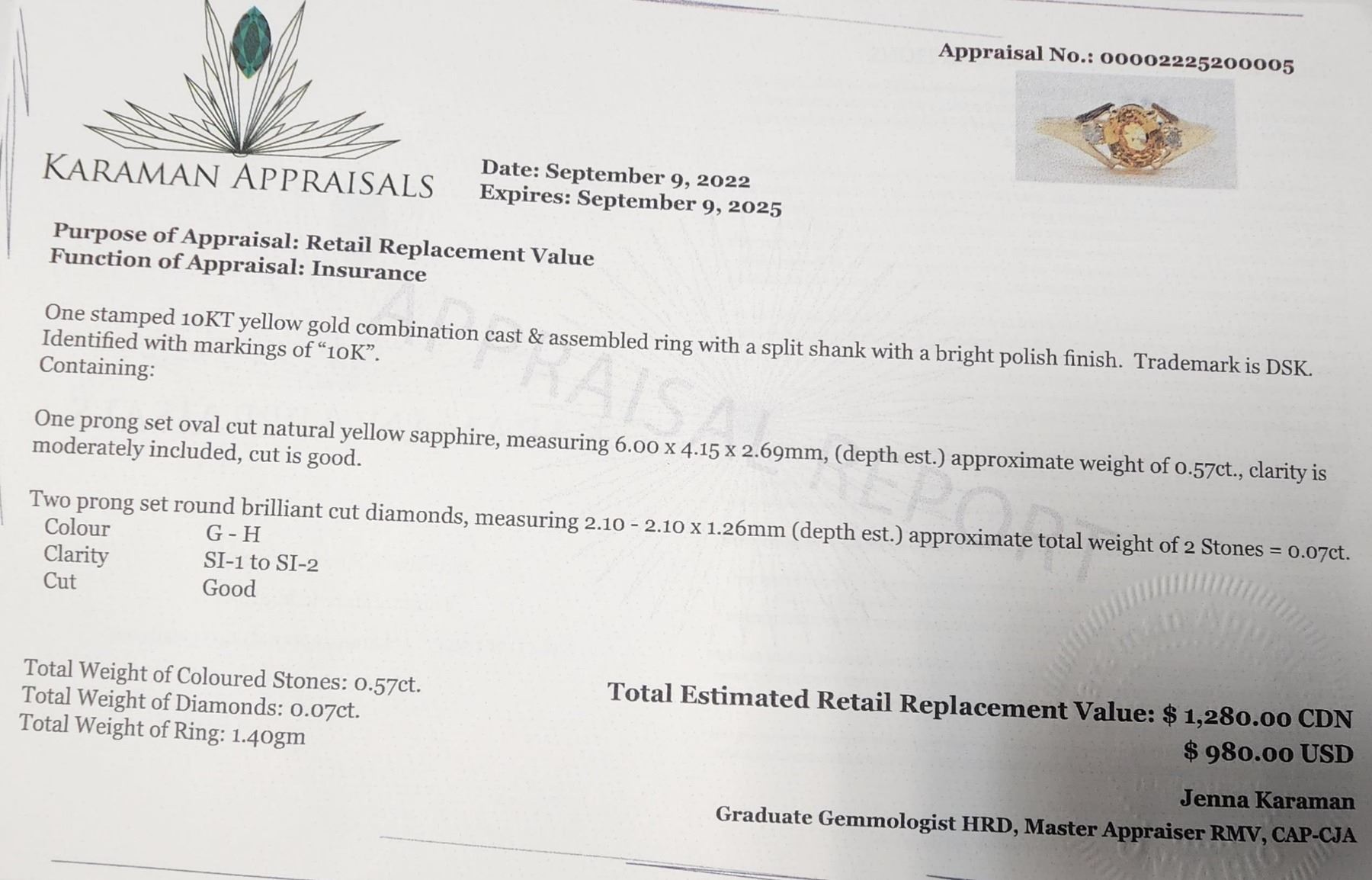 10K YELLOW GOLD, YELLOW SAPPHIRE(0.65CT) DIAMOND(0.07CT) RING SIZE 6.25, WEIGHT 1.4G, MADE IN CANADA, APPRAISED RETAIL $1280 **ALL ITEMS MUST BE REMOVED BY 5PM SATURDAY, MAY 13TH 2023. ALL REMAINING ITEMS WILL BE SUBJECT TO A $6.00 PER DAY STORAGE CHARGE. ANY ITEMS REMAINING AFTER MONDAY, MAY 29TH, 2023 WILL BE CONSIDERED FORFEITED. NO REFUNDS WILL BE ISSUED FOR FORFEITED ITEMS. TO SCHEDULE A PICK UP APPOINTMENT CLICK HERE